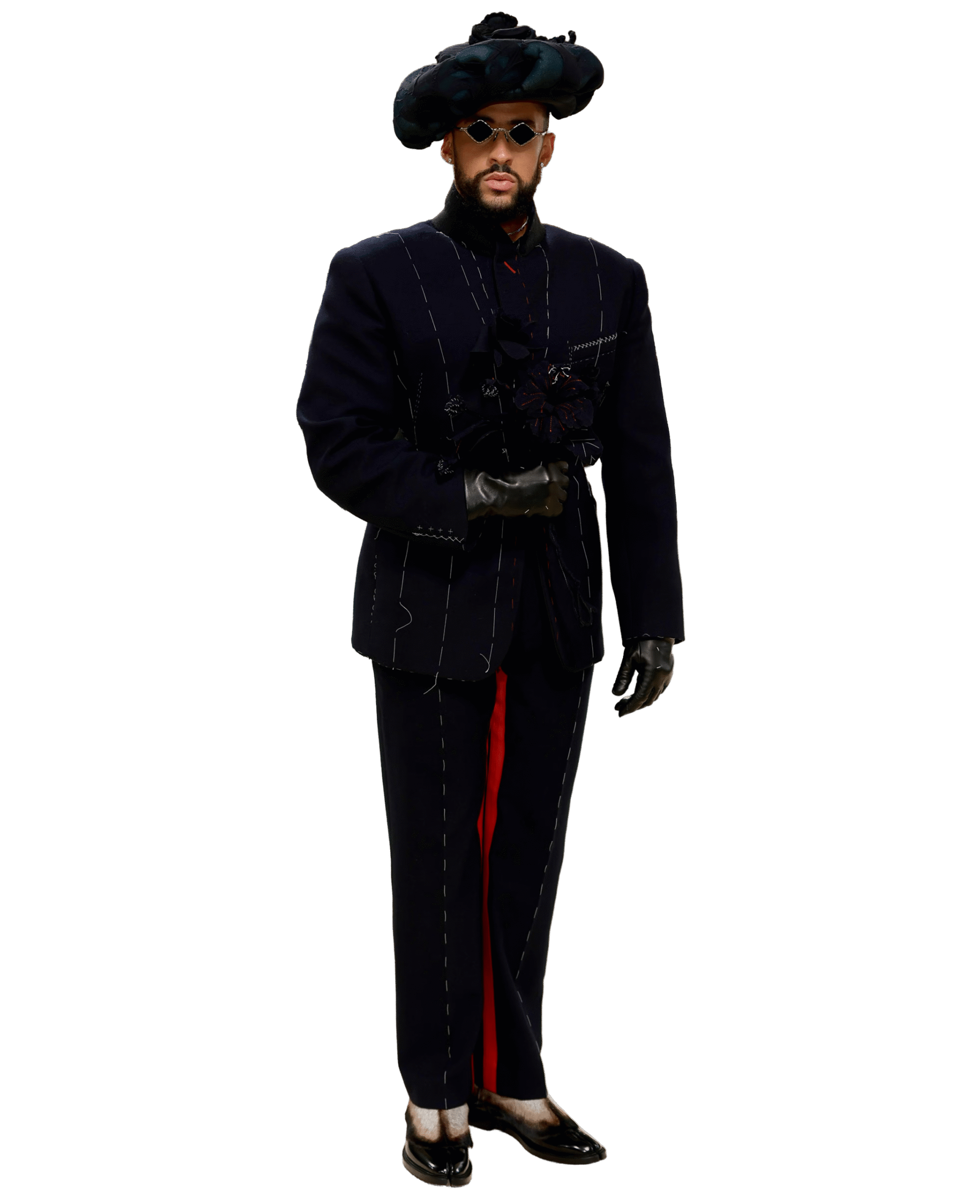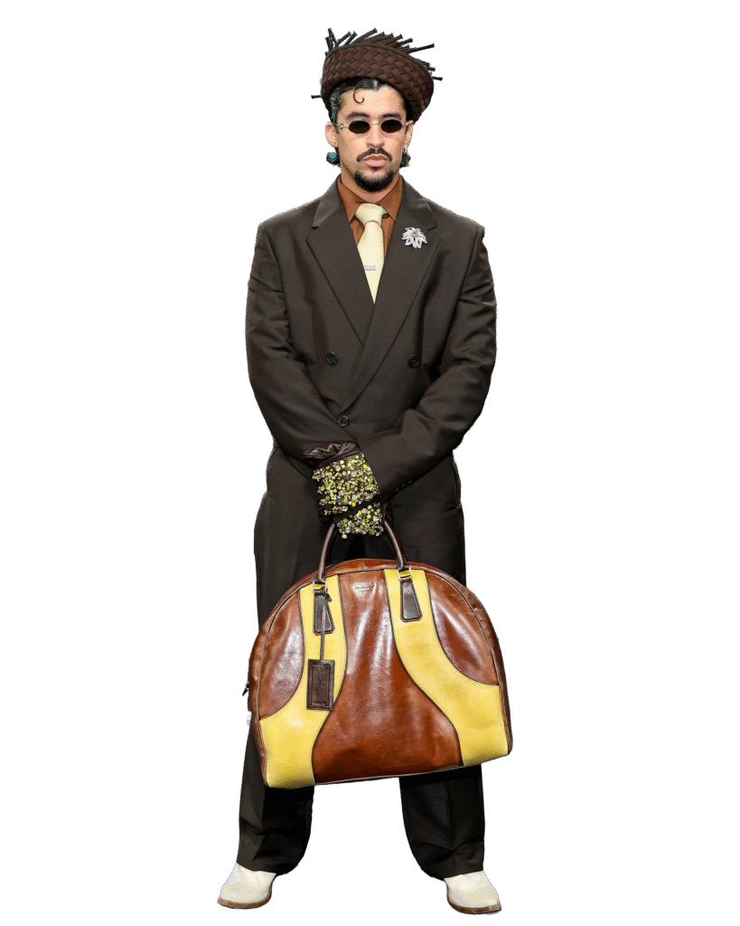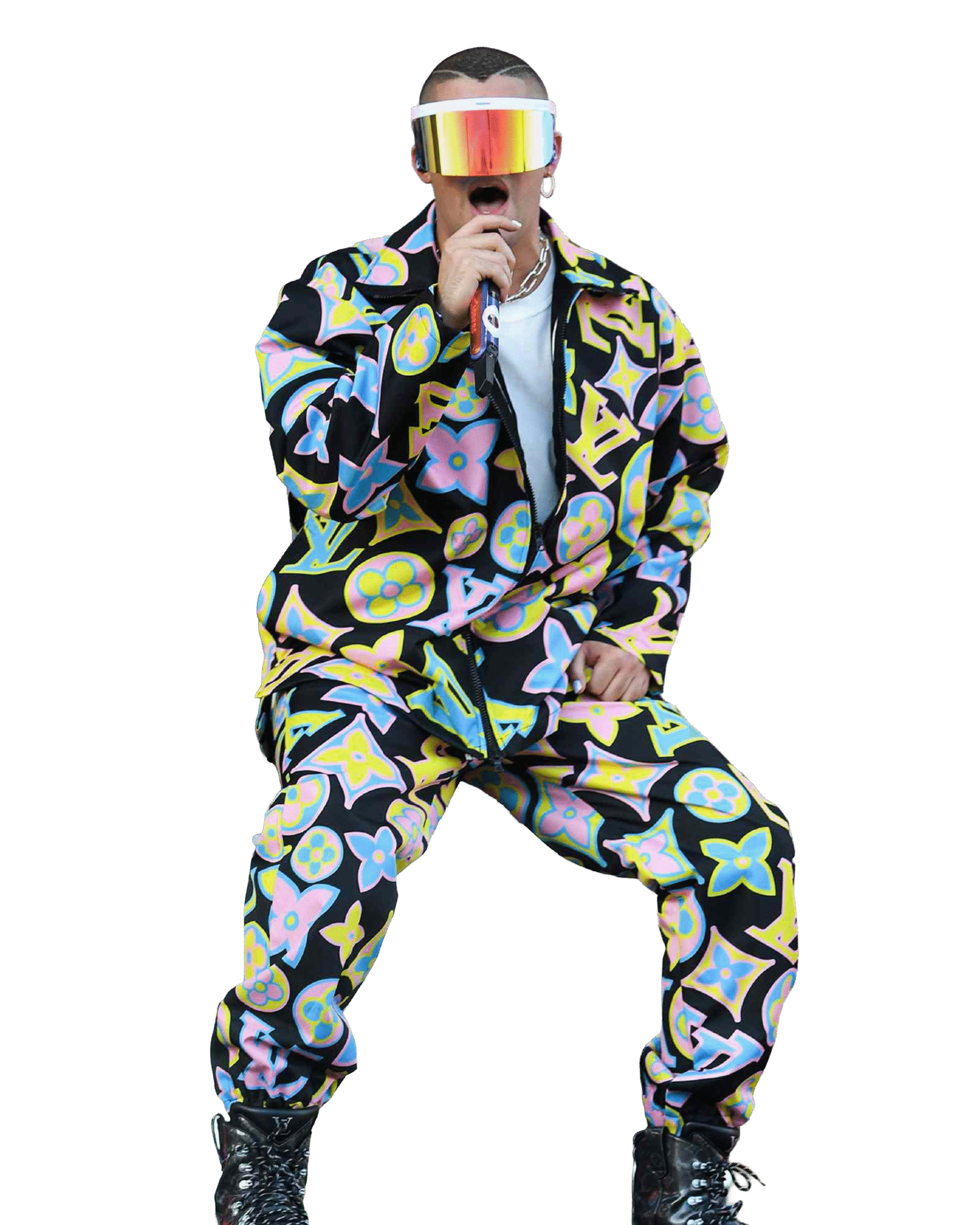 From the start of his career with X 100pre, he’s made fashion an essential part of his identity. Early Bad Bunny leaned into bold colors, oversized silhouettes, and head-turning patterns including neon puffers, wild prints, and Louis Vuitton logos that seemed to have a life of their own. As his influence grew, so did his sartorial risks. Today, he balances sharp tailoring with playful twists: sculptural hats, tinted shades, backwards caps, and details that make a suit feel anything but traditional.