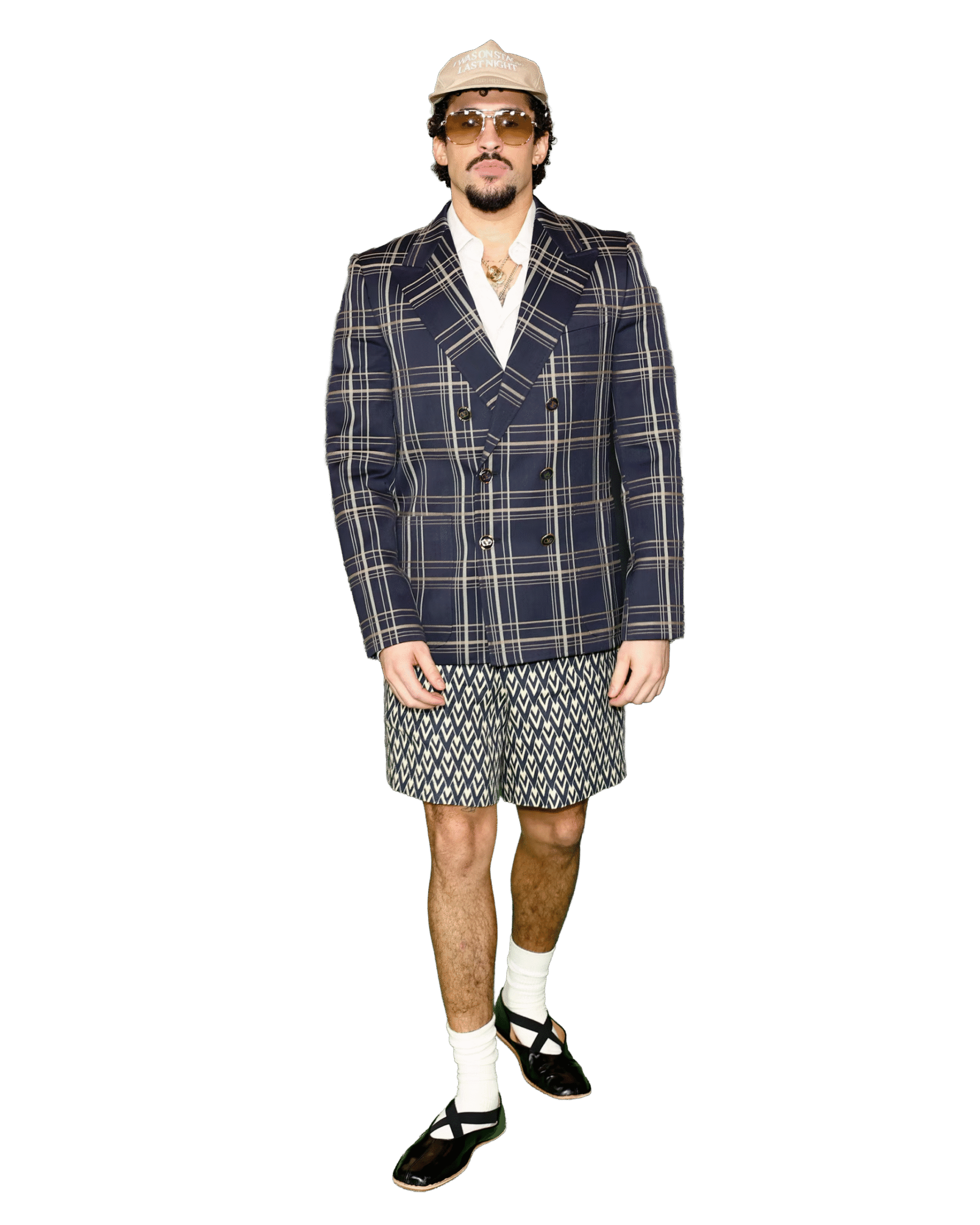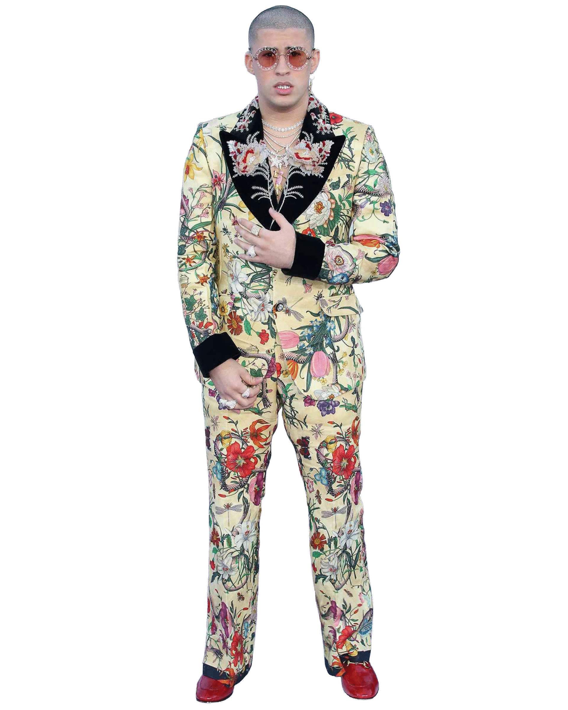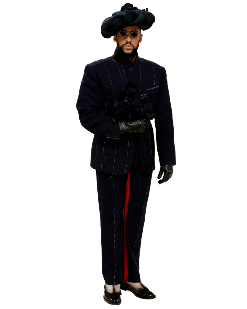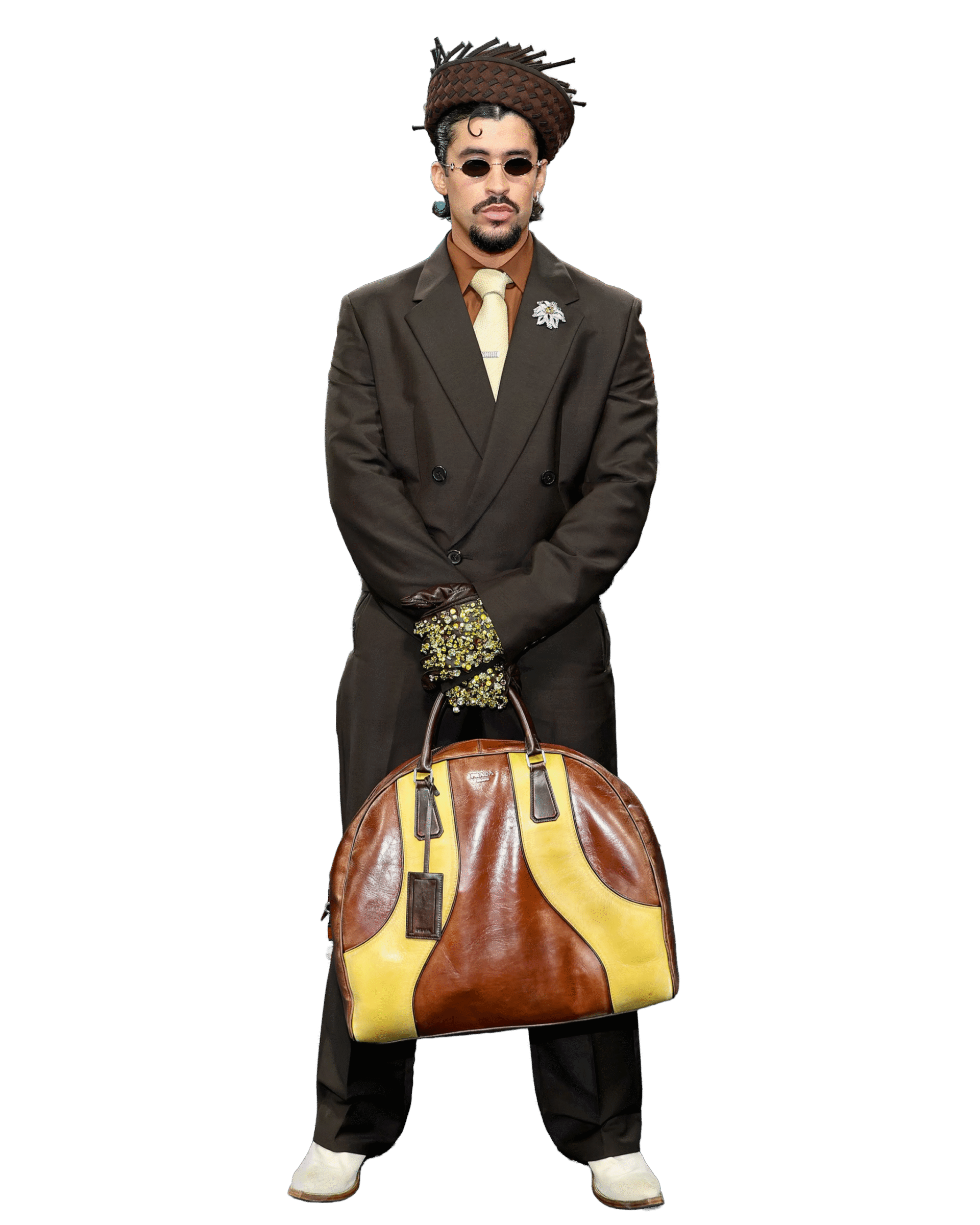 From the start of his career with X 100pre, he’s made fashion an essential part of his identity. Early Bad Bunny leaned into bold colors, oversized silhouettes, and head-turning patterns including neon puffers, wild prints, and Louis Vuitton logos that seemed to have a life of their own. As his influence grew, so did his sartorial risks. Today, he balances sharp tailoring with playful twists: sculptural hats, tinted shades, backwards caps, and details that make a suit feel anything but traditional.